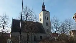 Die chorlose Saalkirche stammt vermutlich aus den Jahren um 1300. Um 1500 erfolgte eine Erneuerung des Ostgiebels mit drei lanzettförmigen Blendnischen. 1672 wurden Kirche samt Glocke und Inventar umfassend erneuert.[1] Im späten 18. Jahrhundert wurden die Fenster der Kirche vergrößert. Der klassizistische Westturm wurde 1856 errichtet.