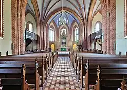 Im Inneren der neugotisch ausgestalteten Kirche haben sich bis auf ein Tafelbild und Glasmalereien keine Ausstattungsgegenstände der Vorgängerkirche von 1601 erhalten. Die vier Glasmalereien sind im Chor mit Darstellungen der Geburt und Taufe Christi, Emmaus und Wappen eingebaut.
