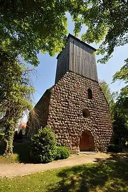 An der Südwestecke des Langhauses wurde ein Quader (Schachbrettstein) mit einem eingeritzten Rautenornament versehen, ähnlich wie bei den Dorfkirchen in Serwest, Schmargendorf und Schönermark bei Angermünde. Der verbretterte Dachturm wurde nach dendrochronologischer Datierung in den Jahren 1708/1709 erbaut und ist mit einer Wetterfahne mit der Jahreszahl 1711 versehen.