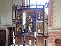 Das geschnitzte Altarretabel aus dem ausgehenden 15. Jahrhundert ist eigentlich ein klappbares Triptychon (Flügelaltar). Es wurde 1698 restauriert und erhielt 1860 einen starren neugotischen Rahmen.