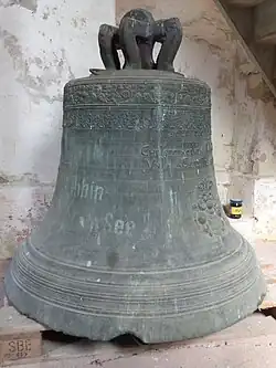 Die in der Inschrift herausgehobenen einzelnen Buchstaben ergeben zusammengezogen als lateinische Zahl die Jahreszahl des Gusses, 1728. Ein solches Chronostichon als Chronogramm in Versform ist eine kostbare Seltenheit. Der Hals der Bronzeglocke ist mit feinen Pflanzenornamenten und pausbäckigen Engeln dekoriert. Diese Bronzeglocke wurde 2002 im Turm abgestellt, weil sie gerissen ist. Sie wurde 1728 von Christoph August von Barold gestiftet.