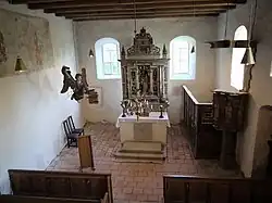 Den hölzernen Kanzelkorb schuf Christian Zimmermann Anfang des 18. Jahrhunderts. Das Dehio-Handbuch bezeichnet ihn als „ungefasste und derb handwerkliche Schnitzerei“. An seinen Ecken stehen die Evangelisten auf Konsolen; dazwischen in den Feldern sind Wappentafeln. Oberhalb ist ein sternförmiger Schalldeckel.