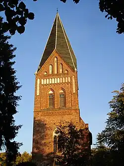 Der 56 Meter hohe quadratische Westturm wurde im 14. Jahrhundert begonnen. Seine neugotischen Obergeschosse mit Blendengiebeln und dem achteckigen Helm sind erst 1888 entstanden.[7] Die neue Kirchturmtür wurde 1890 eingebaut. Im Glockengeschoss hängen zwei Glocken.