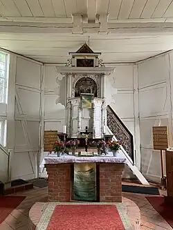 Die Dorfkirche Duben verfügt über eine barocke Ausstattung.[4] Der Ädikulaaltar aus dem Jahr 1684 wurde im 18. Jahrhundert durch den Einbau einer Kanzel zu einem Kanzelaltar umgestaltet. Auf der Predella ist das Abendmahl Jesu dargestellt, flankiert von einer Austeilung des Sakraments durch zeitgenössische Prediger. Die Altarbilder stammen ebenfalls aus der Bauzeit und wurden später nachgemalt.[3] Der Bereich unterhalb der Westempore ist abgetrennt und dient als Winterkirche. Zur weiteren Kirchenausstattung gehören ein Harmonium der Firma O. Lindholm sowie eine schlichte Fünte als Holz. Vor dem Südanbau erinnert ein Denkmal an die Gefallenen der Weltkriege.