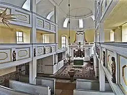 Im Innern ist das Turmerdgeschoss mit einem Tonnengewölbe, das Langhaus mit einem zweifach gebrochenen Holztonnengewölbe abgeschlossen. Eine Doppelempore zieht sich um das Innere; im Westen ist eine Orgelempore, im Osten Patronatslogen mit vergitterten Zierfenstern sowie ein architektonisch gestalteter Kanzelaltar aus der Zeit um 1800 angeordnet. An der Nordostwand des Chores ist eine Sakramentsnische in den reichen Formen des späten 15. Jahrhunderts zu finden.