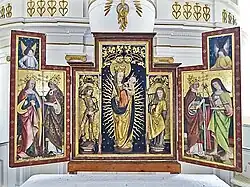 Ein Flügelaltar stammt laut Inschrift von 1498 und wurde von der Saalfelder Werkstatt des Valentin Lendenstreich geschaffen. Er zeigt im überhöhten Mittelteil des Schreins eine Strahlenkranzmadonna, die von den Heiligen Georg und Laurentius flankiert wird. Alle Figuren stehen unter reich geschnitzten Schleierbrettern auf Sockeln. Die Flügel sind mit gemalten Darstellungen der Heiligen Margarethe und Urban (links) sowie Fabian und Sebastian (rechts) auf gepunztem Goldgrund versehen. Die Außenseiten der Flügel zeigen links den Heiligen Christophorus und einen Bischof sowie rechts die Heiligen Georg und Erasmus. Weitere Figuren eines nicht erhaltenen Altars sind an den Emporenpfeilern angebracht.
