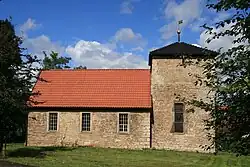 Die Kirche wurde an Stelle einer 1259 dem Kloster Kapellendorf zugeschlagenen Kapelle errichtet. Der jetzige Bau ist auf das Jahr 1813 datiert, wie die Jahreszahl auf der Westtür dokumentiert. Die Holzdecke im Langhaus ist flach. Es wurden rechteckige Türen und Fenster eingelassen. Der Turm verfügte über ein achteckiges, beschiefertes Geschoss mit Schweifkuppel.