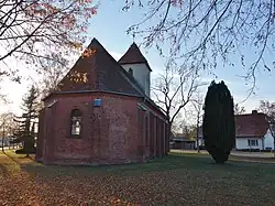 Das Bauwerk wurde im Wesentlichen aus rötlichem Mauerstein errichtet. Der Chor ist nicht eingezogen und besitzt einen Fünfachtelschluss. Am Chorschluss befindet sich ein großes Rundbogenfenster; an jeder Ecke ein Strebepfeiler.