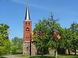Die neugotische Saalkirche wurde 1875 aus Feld- und Backsteinen erbaut. Die Pläne hat Friedrich August Stüler 1861 gefertigt. Das Langhaus und das Erdgeschoss des Kirchturms im Westen bestehen aus Feldsteinen, die Obergeschosse des Kirchturms und die polygonale Apsis im Osten aus Backsteinen. Das oberste Geschoss des Kirchturms beherbergt hinter den als Biforien gestalteten Klangarkaden den Glockenstuhl. Darauf sitzt ein schiefergedeckter, achtseitiger Knickhelm. Die mit spitzbogigen Blenden gegliederten Ost- und Westwände des Langhauses sind mit Staffelgiebeln bedeckt. Die Orgel mit 9 Registern auf zwei Manualen und Pedal hat um 1893 Schlag & Söhne gebaut.[1]