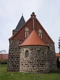 Die Apsis (2,30 Meter × 5,45 Meter) schließt an den in einer früheren Zeit verbreiterten Chor rundbogenförmig an. Drei schmale, bogenförmige Fenster lassen Licht in das Innere. Der neugotische Giebel des Chors besteht aus rötlichen Mauersteinen, in die je zwei weiße, gekuppelte Putzblenden eingelassen sind. Oberhalb der Apsis befindet sich eine weitere, rundbogenförmige Putzblende, die bis hinauf zum Dach führt.