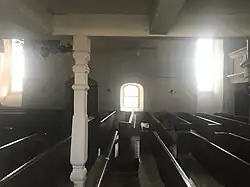 Der Turm war früher mit zwei breiten Spitzbögen zum Schiff hingeöffnet. Das Bauwerk ist im Innern flach gedeckt. Auf der Westempore steht eine Orgel, die Carl Gotthold Claunigk im Jahr 1803 schuf. Von ihm stammt auch das Prospekt des Instruments. An der Südwand erinnert ein Epitaph an den 1712 verstorbenen Michael Exs.