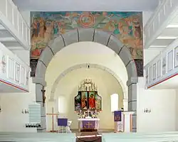 Im Innern ist das Bauwerk flachgedeckt; zweigeschossige Emporen sind eingebaut (an der Nordseite von 1828/69 an der Südseite von 1769), an der Westseite eine Orgelempore. Ein rundbogiger Triumphbogen vermittelt zum Chor; über dem Bogen ist ein Wandgemälde des Jüngsten Tages von Bernhard Müller aus Dresden von 1926 erhalten, in Chor und Apsis Reste älterer Wandfassungen. Die Sakristei ist mit einem Tonnengewölbe geschlossen.