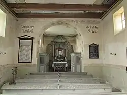 Auffällig ist der barocke und reich gestaltete Kanzelaltar. Dieser wurde einer Inschrift entsprechend von einem M. Adam Bortfleisch, einem Tischler aus Stendal, am 26. Juni 1699 errichtet. Die Wände sind verputzt und mit Malereien verziert. Der Triumphbogen zwischen Schiff und Chor ist ebenfalls verziert. Eine zweiteilige Frakturschrift an der östlichen Wand des Schiffs beidseits des Triumphbogens lautet „Ich bin der Weinstock, ihr seid die Reben.“ Auf hölzernen Tafeln stehen die im Ersten Weltkrieg gefallenen Gemeindemitglieder vermerkt. Die Orgel auf der Westempore ist nicht funktionstüchtig. Sie wurde vom Orgelbaumeister E. Erdmann aus Neuhaldensleben gebaut. An der Nord- und an der Südseite des Chorraumes befindet sich das separierte Patronatsgestühl. Die Holzbalkendecke ist ebenfalls verputzt und farblich gestaltet.