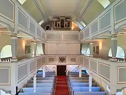 Der Innenraum ist mit einem hölzernen Tonnengewölbe überspannt. Die zweigeschossigen Emporen ziehen sich um den Raum. Ihre Brüstungen sind mit Rollwerk und Beschlagwerk verziert. Auf der unteren Empore befindet sich im Westen die alte Patronatsloge. Sie dient heute der Verwahrung von Archivgut. Deshalb sind ihre Fenster heute mit Holz verkleidet. Auf der oberen Empore befindet sich die Orgel. Sie hat acht Register, verteilt auf ein Manual und Pedal.[2] Sie wurde 1750 von Andreas Franke[3] gebaut und zum letzten Mal 1998 von Hartmut Schüßler[4] nach Feuchtigkeitsschäden notrepariert.