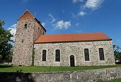 Die frühgotische Feldsteinkirche wurde in der zweiten Hälfte des 13. Jahrhunderts aus einem Langhaus und einem querrechteckigen Kirchturm, der dessen Breite leicht überragt, gebaut. Sie wurde in der Mitte des 18. Jahrhunderts barock umgestaltet, bei dem ihre Fenster vergrößert wurden. Im Ostgiebel wurde von der frühgotischen Dreifenstergruppe, das Mittelfenster zugesetzt. An der Westseite des Kirchturms befindet sich ein Portal mit spitzbogigem Gewände, ein weiteres wurde in die Südwand des Langhauses eingebrochen.