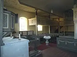 Der verputzte Backsteinbau hat einen dreiseitigen Ostschluss und einen westlichen Dachturm. Die Turmhaube wurde im Jahr 1980 erneuert. Die Innenausstattung stammt aus der Bauzeit der Kirche, vom Vorgängerbau ist lediglich ein Bruchstück einer Sandsteingrabplatte aus dem Jahr 1604 erhalten. Der Kanzelaltar, Taufstein sowie Orgelprospekt sind in klassizistischen Formen gehalten. Über der Raummitte befindet sich ein Muldengewölbe.[2] Die Emporenkästen sind zur Saalmitte hin mit Serifenschrift verziert.