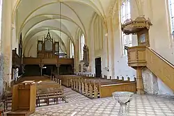 Das Kirchenschiff und der Chor sind baulich bis auf eine Erhöhung des Chors um zwei Stufen ohne Übergang getrennt und bilden unter den Kreuzgewölben somit eine Einheit. An der Südseite befindet sich neben den ersten drei von fünf Jochen des Kirchenschiffes hinter dem Turm ein Seitenschiff mit drei Kreuzgewölben. Am mittleren Joch ist an der Nordseite des Schiffes eine quadratische Eingangshalle angebaut.