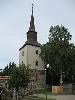 Die Feldsteinkirche wurde in der zweiten Hälfte des 13. Jahrhunderts erbaut. Das untere Geschoss des freistehenden quadratischen Kirchturms aus dem 13. Jahrhundert südwestlich des Langhauses ist aus Feldsteinen. Er wurde 1717 um zwei Geschosse aus verputzten Backsteinen erhöht und mit einem achtseitigen Knickhelm bedeckt, der in der Mitte von einer Laterne unterbrochen ist.