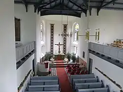 Die neugotische Kreuzkirche wurde 1882–84 unter Einbeziehung von Teilen des bei einem Brand zerstörten mittelalterlichen Vorgängerbaus erbaut. Sie besteht aus einem Langhaus, das von einem Querschiff gekreuzt wird, beide mit Satteldächern bedeckt, einem polygonalen Chor im Osten und einem querrechteckigen Kirchturm im Westen, der mit einem schiefergedeckten Walmdach bedeckt ist.