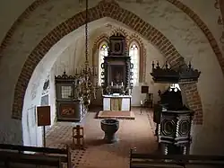 Die Ausstattung der Kirche aus Altar, Kanzel, Patronatsloge und Empore stammt stilgleich aus der Zeit vom Übergang der Renaissance zum Barock und wurde, nachdem sie seit dem 19. Jahrhundert übermalt war, bei der Restaurierung der Kirche in den 1960er Jahren wieder in ihre ursprüngliche Farbigkeit in Grau, Blau, Rot und Gold versetzt.
