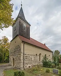 Das Schiff kann durch ein Portal von Westen her betreten werden. Oberhalb erhebt sich ein verbretterter Turmhelm, der an jeder Seite eine kleine, hochrechteckige Klangarkade und darüber eine Turmuhr besitzt. Darauf sitzt ein achtfach geknickter Turmhelm, der mit Turmkugel und Wetterfahne abschließt.