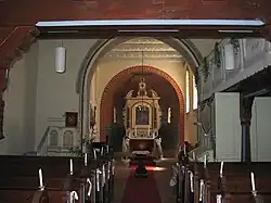 Der ehemalige Altaraufsatz vom Ende des 17. Jahrhunderts befindet sich nach der Restaurierung von 1990/91 wieder im Chor.[2] Er zeigt ein Abendmahlsgemälde zwischen Säulen, im gesprengten Giebel ist ein kleines Kreuzigungsbild, darüber ein Medaillon mit der Auferstehung angeordnet. Vier Schnitzfiguren von einem Altar aus der Zeit um 1430 zeigen Maria als gekrönte Braut neben Christus thronend, flankiert von Maria Magdalena und einem heiligen Bischof.
