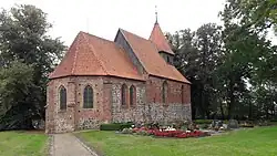Das kurze Kirchenschiff und der Westturm in gleicher Breite wurden zum Ende des 13. Jahrhunderts in Feldstein begonnen und in der ersten Hälfte des 14. Jahrhunderts in Backstein vollendet. Im unteren Bereich der Nord-, West- und Südwand reicht der Feldstein bis etwa zur Hälfte der Wandhöhe, der Ziegelbereich an der Westwand ist verputzt. Der Chor mit dreiseitigem Schluss und äußeren Strebepfeilern wurde ebenfalls in der ersten Hälfte des 14. Jahrhunderts angefügt und das Schiff und der Chor wurden kreuzrippengewölbt, die Gewölbe ruhen auf Konsolen. Der Chor ist ein wenig niedriger als das Schiff, seine drei Wände sind durch je ein gotisches Fenster gegliedert. In das schmale Turmjoch wurde später eine flache Decke eingezogen, es ist vom Schiff durch einen Gurtbogen getrennt. Die Turmoberteile wurden 1699 nach einem Blitzschlag durch Brand zerstört. Anfang des 18. Jahrhunderts wurde das Gebäude mit einem Walmdach gedeckt, das mit einem niedrigen Turmaufsatz aus Holz bekrönt ist, er ist, ebenso wie die Dachfläche, mit roten Ziegeln gedeckt. Bis 1989 war das Gebäude mit der althergebrachten Dachdeckung der einst üblichen Mönch-Nonne-Deckung eingedeckt. Bei der Neueindeckung im Jahr 1990 wurde zu Anschauungszwecken der Urzustand an der nördlichen Turmseite erhalten.[3] Die Wände sind durch schmale Rundbogenfenster gegliedert. Das Portal in der Südwand des Schiffes ist mit eingestellten Rundstäben versehen. Der Anbau an der Südseite des Chores wurde wohl im 15. Jahrhundert angefügt, der Blendgiebel ist abgetreppt Die Wände im Innenraum sind zum Teil mit Ornamenten bemalt. Die Nordempore wurde 1671 als Patronatsloge eingebaut, sie zeigt an der Brüstung geschnitzte und bemalte Wappen der Familie von Oertzen, die das benachbarte Gut Gorow besaß, sowie ihrer Vorfahren aus den Familien Zülow, Wackerbarth und Reventlow.