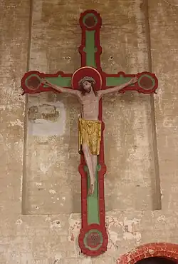 Das bedeutendste vorreformatorische Kunstwerk ist das ausdrucksstarke, fast lebensgroße Kruzifix, das einst zu einer Triumphkreuzgruppe gehört haben muss und gegen 1300 entstanden ist. Hinter dem Altar, mit Ölfarbe bemalt und mehrfach beschädigt, wurde es zu Zeiten von Pastor Georg Meltzer 1675 repariert.[5] Während sie am Korpus bis auf größere Fassungsverluste und ein stark aufsteigendes Krakelee noch relativ gut erhalten war, löste sich die obere Fassung am Kreuz großflächig in kleinen Schollen ab. Eine Freilegung der mittelalterlichen Fassung war äußerst kompliziert, daher entschloss man sich dazu, die Sichtfassung am Korpus zu erhalten. Reste der alten Fassung wurden aufwändig gesichert, die vielen Fehlstellen aufgekittet und entsprechend der Umgebungsfarbigkeit retuschiert. Holztechnisch wurden am Korpus der Daumen der linken Hand und ein Teil des unteren Vierpasses ergänzt, was durch Vergleiche am Objekt möglich war. Ausgeführt wurden diese Arbeiten 2006 durch die Restauratorin Anette Seiffert.[6]