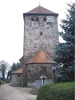 Die Kirche wurde wahrscheinlich um 1200 im romanischen Baustil aus Feldsteinen errichtet und zählt zu den wenigen Kirchen mit östlichem Chorturm. Der Chorraum ist rechteckig, an ihn schließt sich eine kleine Apsis an. Hier und im Kirchenschiff sind zum Teil die typischen kleinen romanischen Fensteröffnungen vorhanden. An der Nord- und Südwand des Kirchenschiffs sind noch zwei vermauerte Rundbogenportale zu erkennen.
