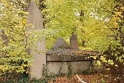 Zwei Grabplatten stammen aus dem 14. Jahrhundert. Durch seine lange und schmale Form, auch schmaler am Fußende als am Kopfende, findet der Leichenstein mit dem Johanniterkreuz besondere Erwähnung. Der zweite Stein wurde dem Pleban Johannes Stolteer von 1333 zugeordnet, was aber in Zweifel gestellt wird.[15] Auf der Südseite der Kirche befindet sich eine monumentale Granitgruft, die wahrscheinlich durch die Familie von der Lühe angelegt wurde, welche die Güter von Hornstorf im Jahr 1849 übernahm und 1929 wieder verkaufen musste.[16]