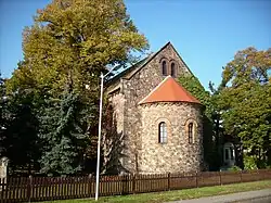 Hier ist das in seiner heutigen Form in der Mitte des 19. Jahrhunderts entstandene Bauwerk mit einem Friedhof in der Ortsmitte zu finden. Es wird baulich dem Rundbogenstil der Berliner Schule zugeordnet. Ein bemerkenswertes Ausstattungsstück der Kirche ist eine zur Taufe umgearbeitete mittelalterliche Glocke.[2][3]