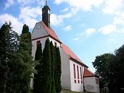 Die Dorfkirche Königsfeld ist eine kleine Saalkirche mit einem niedrigen Turm aus dem 15. Jahrhundert, der Saal wurde im Jahr 1754 eingreifend erneuert. Restaurierungen wurden in den Jahren 1830, 1953/1995 und 1997 vorgenommen. Das Bauwerk ist aus verputztem Bruchsteinmauerwerk erbaut und endet in einem geraden Chorschluss. Östlich schließt sich eine kleine Sakristei an, auf der Chorsüdseite eine Patronatsloge. Der kompakte Westturm ist mit einem Krüppelwalmdach und einem schlanken verschieferten Dachreiter abgeschlossen. An der Nordseite des Turms ist ein Portal in Spitzbogenform mit verschränktem Stabwerk, nach Westen ein vermauertes Rundbogenportal und ein kleines spitz zulaufendes Fenster mit verschränktem Stabwerk angeordnet.