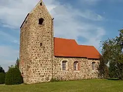Die Kirche ist ein stattlicher Feldsteinsaal mit eingezogenem quadratischem Chor und Westquerturm aus der Mitte des 13. Jh. Die ehemaligen Zugänge an der Nordseite sind mit spitzbogigen Archivolten aus Backstein versehen. Eine Zweifenstergruppe an der Ostseite ist erhalten, in den Laibungen sind umfangreiche, wohl mittelalterliche Putzreste vorhanden; die Laibungskanten aus Backstein sind unverputzt. Das Bauwerk ist aus unregelmäßigen, aber lagig versetzten Feldsteinen erbaut. An der Nordseite des Chores liegt die heute vermauerte Priesterpforte mit Gewände aus Feldstein und einem Spitzbogen aus Backstein. Das ebenfalls vermauerte Portal an der Nordseite ist ähnlich ausgeführt. In der Westwand ist ein neuzeitliches Portal sowie eine ebenfalls neuzeitliche Öffnung darüber eingelassen. Der Dachstuhl über dem Schiff wurde dendrochronologisch auf die Jahre 1464/66 datiert, der über dem Chor stammt vermutlich aus der gleichen Zeit.[1] Das relativ hochräumige Innere ist flachgedeckt, mit spitzbogigem Triumphbogen; auch der Turm ist in hohem Spitzbogen zum Schiff geöffnet. Ein Grabstein und ein ganzfiguriges Bildnis (1704) des Pastors Christophorus Praetorius († 1730) sind außerdem erhalten, der Grabstein wurde nach der Inschrift bereits zu Lebzeiten des Pfarrers angefertigt.