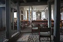 Der Kanzelaltar in der Kirche ist auf das Jahr 1721 datiert und wurde 1883 umgestaltet. Er hat einen doppelten Säulenaufbau mit einem abschließenden Segmentbogengiebel und einen nachträglich eingebauten fünfseitigen Kanzelkorb. An der Vorderseite der Kanzel befindet sich eine barocke Darstellung des Abendmahls mit einer Stifterinschrift. Die Orgel wurde 1883 von Robert Uibe gebaut und hat eine mechanische Schleiflade. Das Instrument verfügt über elf Register auf zwei Manualen und dem Pedal.[4]