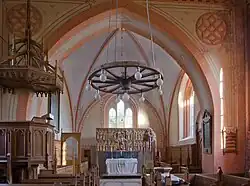 Das Hauptstück der Ausstattung ist ein qualitätvoller spätgotischer Schnitzaltar aus der Zeit um 1500. Im Schrein ist eine apokalyptische Madonna dargestellt, die von Aposteln und Heiligen in zwei Reihen im Schrein und in den Flügeln flankiert wird. Auf der Flügelrückseite sind Christus in Gethsemane und die Gefangennahme sowie Christus vor Pilatus und Dornenkrönung als Gemälde dargestellt. Ein Pastorengemälde ist aus dem 18. Jahrhundert erhalten.