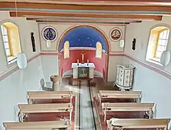 Der Innenraum ist mit einer Holzbalkendecke überspannt. Auf der Empore im Westen, unter der eine Winterkirche eingerichtet wurde, steht eine kleine Orgel von Ludwig Glöckner mit drei Registern auf einem Manual und angehängtem Pedal.[1]