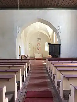 Die Apsis trägt in Innern eine Halbkuppel; der Chor ein einjochiges Kreuzgratgewölbe mit einem darüberliegenden Dachstuhl, der noch aus dem Spätmittelalter stammen könnte. Das Schiff ist in seinem Innern flach gedeckt. Im Turm sind Überreste des Tonnengewölbes erhalten geblieben.