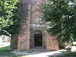 Der querrechteckige Westturm weist keine Baunaht auf und dürfte damit ebenfalls aus der Bauzeit stammen. Er nimmt die Breite des Kirchenschiffs auf und ist 6,3 m lang. Im Westen sind zwei mächtige, moderne und aus Mauersteinen errichtete Strebepfeiler, die bis in das Glockengeschoss reichen; dazwischen eine Rundbogenpforte. Oberhalb des aus Feldsteinen errichteten Eingangsbereichs sind drei übereinander angeordnete Rundbogen erkennbar (Ausbesserungsarbeiten?); oberhalb eine rundbogenförmige Öffnung. An der Nordseite ist ein kleines Fenster, das aus der Bauzeit stammen dürfte; gleiches gilt für die Südseite. Im mittleren Geschoss ist eine hochrechteckige Öffnung. Darüber wie auch an der Nordseite ebenfalls eine rundbogenförmige Öffnung. Im Glockengeschoss wurden ausschließlich Mauersteine verwendet. Es schließt mit einem quergestellten Walmdach ab.