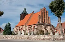 Die Kirche, um 1350 entstanden, hat ein quadratisches Schiff und einen quadratischen Chor. Die Mauern sind aus Feldstein, nur die Giebel aus Ziegeln errichtet. Der Turm in Fachwerk wurde später aufgesetzt. Die fünf Blenden und sechs Pfeiler des Staffelgiebel sind ein monumentales Zeugnis der gotischen Bauhütten des Ordensstaates.
