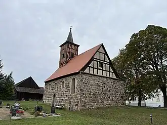 Die Dorfstraße führt von Westen kommend in den historischen Dorfkern. Dort zweigt sie nach Norden hin ab. Von dieser Verbindung wiederum führt die Belziger Straße in nordwestlicher Richtung aus dem Ort. Die Kirche steht südwestlich dieser Kreuzung auf einem nach Norden ansteigenden Grundstück mit einem Kirchfriedhof, der mit einer Mauer aus unbehauenen und nicht lagig geschichteten Feldsteinen eingefriedet ist.