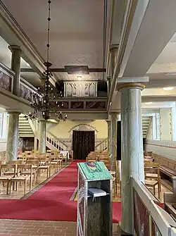 Die Kirchenausstattung stammt im Wesentlichen aus der Zeit nach dem großen Brand und kam 1832 in das Bauwerk, darunter ein Kanzelaltar, eine Fünte, das Gestühl sowie eine Orgel. Im Turm hängen Glocken, die von J. F. Thiele in Berlin gegossen wurden. Das Bauwerk ist im Innern flach gedeckt und ornamental ausgemalt. Auf der Empore steht eine Orgel mit acht Registern auf einem Manual und Pedal, die Friedrich Hermann Lütkemüller im Jahr 1853 errichtete.
