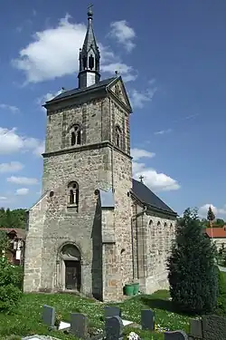 Der Kirchturm mit Zinnen und hoher Spitze deutet auf eine einstige Wehrkirche Richtung Rudolstadt hin.