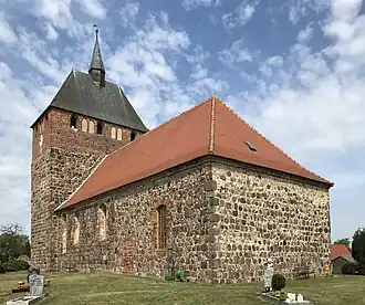 Das Bauwerk entstand Anfang des 13. Jahrhunderts, vermutlich im ersten Viertel als vollständige Anlage. Auf der Langwand des Kirchenschiffs waren vermutlich auf jeder Seite vier, im Chor vermutlich zwei Fenster auf der Nord- und Südseite. Hinzu kamen drei Fenster in der Apsis sowie die Priesterpforte an der Nordseite des Chors. Das Brandenburgische Landesamt für Denkmalpflege und Archäologische Landesmuseum (BLDAM) geht davon aus, dass der Kirchturm nachträglich in Feldstein ummantelt und dabei erhöht wurde. Dies könnte, so auch Theo Engeser und Konstanze Stehr, erklären, warum er mit 65 cm leicht über die Schiffsbreite hervorspringt. Er war vermutlich nur rund drei Meter höher als die Dachtraufe des Schiffs. Anfang des 14. Jahrhunderts dürfte er aufgestockt worden sein und dabei ein hölzernes Glockengeschoss erhalten haben. Aus dendrochronologischen Untersuchungen ist bekannt, dass in den Jahren 1409/1410 der Turm erneut erhöht wurde. Dabei wurde das hölzerne Geschoss durch Mauerwerk ersetzt, der Verbindungsbogen zwischen Turm und Schiff vermauert und ein eigener Zugang auf der Nordseite erstellt. Vermutlich wurde zu dieser Zeit auch die Priesterpforte erstmals verändert.