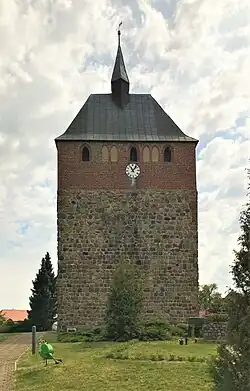 Der Kirchturm ist mit 11,10 m überschiffsbreit und 6,45 m lang. Die Steine sind im unteren Bereich behauen und lagig geschichtet, stimmen jedoch nicht mit den Lagen im Schiff überein. Oberhalb der Traufhöhe des Schiffs wird das Mauerwerk unregelmäßig; oberhalb ein Ziegelaufsatz. Dort befinden sich mehrere spitzbogenförmige Öffnungen, die mittig als gekuppelte Blenden, an den Außenseiten als Klangarkaden ausgeführt wurden. An der Nord- und Südseite befinden sich außen jeweils die Klangarkaden gefolgt von zwei mittig angeordneten und gekuppelten Blenden. Darunter ist jeweils eine Turmuhr. Oberhalb erhebt sich ein quergestelltes Satteldach, das nach Norden und Süden jeweils abgewalmt ist. Darüber erhebt sich ein sechsseitiger Dachreiter, der mit Turmkugel und Wetterfahne abschließt.