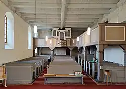 Der barocke Altar entstand in der ersten Hälfte des 18. Jahrhunderts. Er besteht aus gedrehten Randsäulen mit geschnitzten Wangen, die mit Akanthus verziert wurden. Im Altarblatt ist die „Erweckung der Tochter des Jairus“ aus dem Evangelium nach Matthäus dargestellt; ein Werk aus dem Ende des 19. Jahrhunderts. Eine polygonale, hölzerne Kanzel steht auf einer gedrehten Säule. Zur weiteren Kirchenausstattung gehört eine zwölfeckige Fünte aus Kalkstein mit einem Rundbogenfries am oberen Rand. Das Kirchengestühl stammt aus dem 19. Jahrhundert. An der Nord- und Westseite steht je eine Empore; auf der Westempore eine Orgel mit einem schlichten Prospekt.