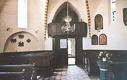 In der Apsis befindet sich der neugotische Altar mit Kreuzigungsszene. Am Übergang von Apsis zum Hauptraum steht die gemauerte Kanzel mit Evangelistenreliefs aus dem 17. Jahrhundert. An den Wänden hängen zinnerne Sargbeschläge mit Wappen der Patronatsfamilien aus dem 18. und 19. Jahrhundert, Kabinettscheiben von 1680 ergänzen die Ausstattung. Der sechsarmige Kronleuchter aus Messing, der vom Schlussstein des Gewölbes in den Kirchenraum herabhängt stammt aus dem 17. Jahrhundert. Die beiden bronzenen Leuchter beidseitig des Altars wurden 1698 von Adam Levin von Knuth gestiftet. Die Grabkapelle der Familie Knuth ist mit einer eichenen Holztür und der davor befindlichen kunstvollen schmiedeeisernen Gittertür von 1736 verschlossen. Die Glocke wurde 1709 von Adam Levin von Knuth und seiner Frau Cornelia gestiftet.[6]