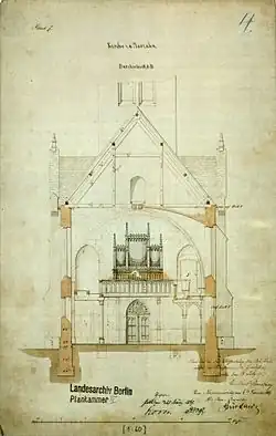Den Kostenanschlag und die beiliegenden Pläne fertigte der Kreisbauinspektor Adolf Bürckner, basierend auf einem von 1857 datierenden Entwurf des 1865 verstorbenen Geheimen Oberbaurates Friedrich August Stüler.[8][9] Der Entwurf entstand im Rahmen der amtlichen Tätigkeit Stülers als Ressortchef für Kirchenbau im Ministerium für Handel, Gewerbe und Öffentliche Arbeiten seit Herbst 1853.[10]