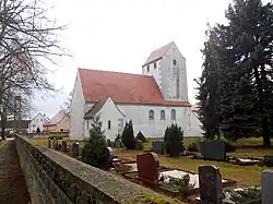 Die im Kern romanische Saalkirche wurde in den Jahren 1616–1617 erneuert. Restaurierungen wurden in den Jahren 1961 (außen), 1965/66 (innen) sowie 1991 durchgeführt. Das Bauwerk ist ein verputzter Bruchsteinbau mit einem an den Ecken abgesetzten Quaderputz. Über dem Westteil erhebt sich ein querrechteckiger, von zwei Strebemauern gesicherter Turmaufsatz mit Satteldach. Die Sakristei ist im Norden, eine Vorhalle im Süden angebaut, daran ist eine Nische mit einer gemalten Kreuzigungsdarstellung eingelassen, welche später wieder übermalt wurde. An der Südseite ist ein vermauertes romanisches Fenster erkennbar.