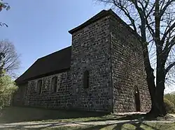 Das Bauwerk entstand im Wesentlichen aus Feldsteinen, die je nach Bauzeitraum mehr oder minder sorgfältig bearbeitet wurden. Die rund 6,3 m breite, halbrunde, ca. 2,2 m ausgewölbte Apsis ist stark eingezogen, dort sind die Steine grob gequadert und lagig geschichtet. Es gibt drei kleine Rundbogenfenster, die aus der Bauzeit stammen dürften. Sie waren zu einem früheren Zeitpunkt zugesetzt, wurden aber 1946 wieder geöffnet.