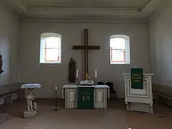 Der Fußboden ist mit schlichten, rot-schwarzen Steinen ausgelegt. Die Wände sind schmucklos und mit einem weißen Putz versehen. Darauf liegt eine flache, grau gestrichene Balkendecke. Ähnlich schlicht sind die drei Emporen, die mit braun-weißen Verzierungen gestaltet wurden.